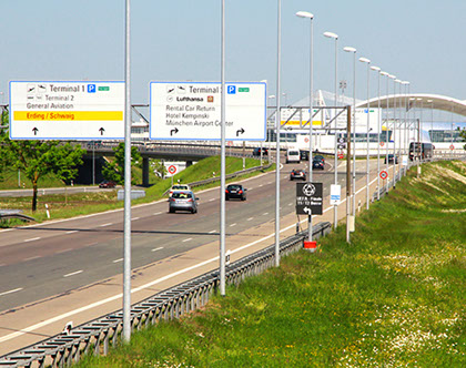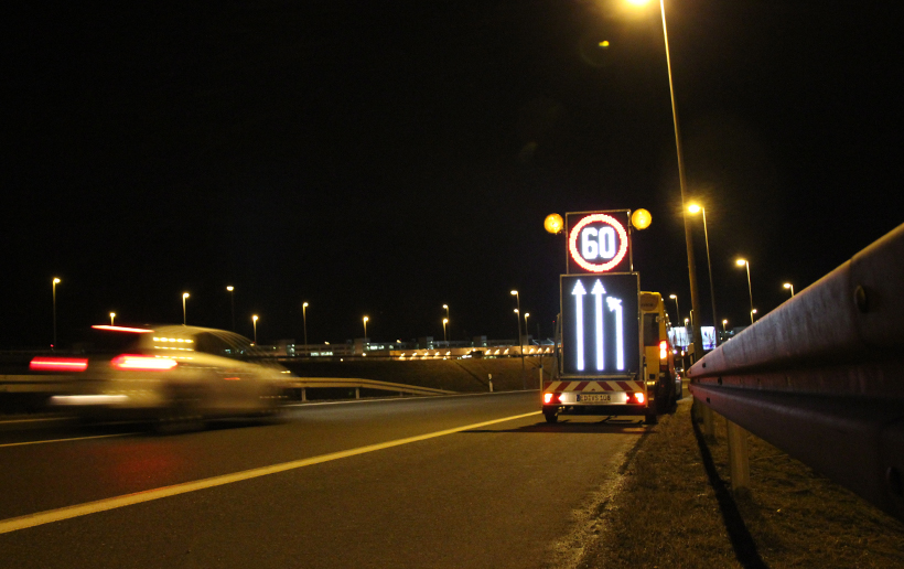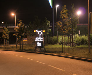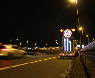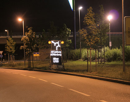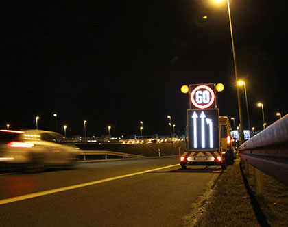 Neben mobilen Stauwarnanlagen, die vermehrt bei Baustellen in kritischen Autobahnabschnitten zum Einsatz kommen, bieten wir auch mobile LED-Wechselverkerszeichen an. Die Vollflächenmatrix ist frei programmierbar, neben der Darstellung von Verkehrszeichen und Spurlenkungstafeln in StVO-konformer Größe und Farbe können Texte und Grafiken passend zum jeweiligen Einsatzbereich programmiert und angezeigt werden.